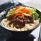 雖然是川味牛肉麵,味道卻濃而不辣,雖有濃郁的湯頭,口感卻是香而不膩,紅褐色的湯汁,包覆著細白的麵條,加上滷得入透的牛肉,有結實的肉塊,還有琥珀般剔透的牛筋,上面再撒上